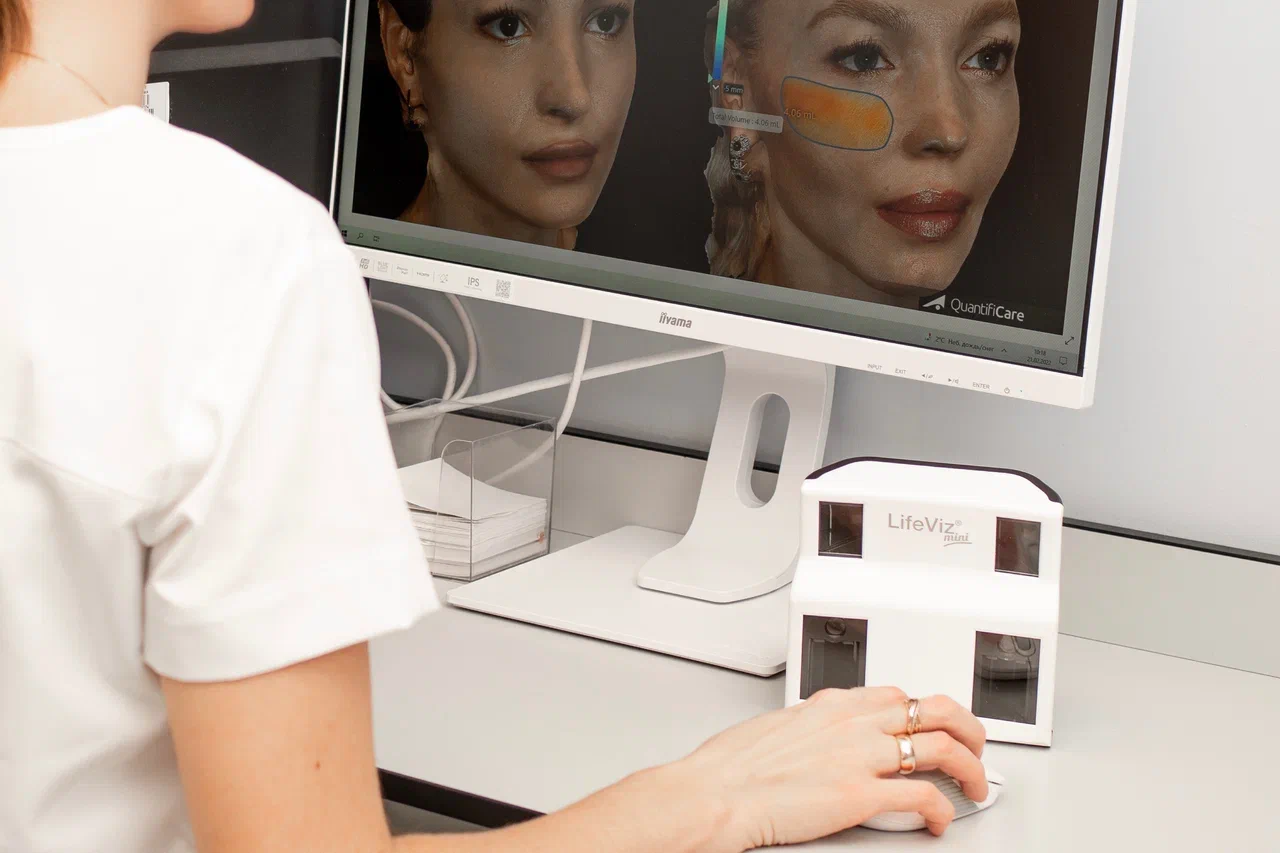 В отличие от большинства студий красоты, мы работаем именно как медицинское учреждение: проводим интеллектуальную 3D-диагностику на интеллектуальной камере. Это позволяет выявить малейшие нюансы состояния кожи и тканей, недоступные при обычном осмотре и составить высокоэффективный персональный план коррекции.
